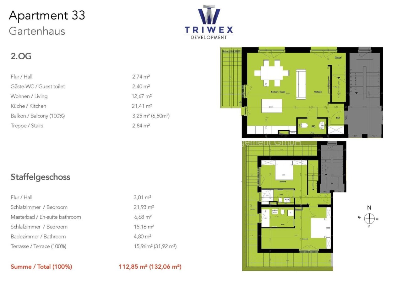 Das Penthouse überzeugt durch eine großzügige, durchdachte Raumaufteilung und ein außergewöhnlich lichtdurchflutetes Wohnambiente. Bodentiefe Fenster mit dreifacher Verglasung unterstreichen die Offenheit der Räume und sorgen für eine helle, einladende Atmosphäre. Zwei großzügige Terrassen in Nord- und Südausrichtung erweitern den Wohnraum ins Freie und bieten zu jeder Tageszeit den idealen Ort für entspannte Momente – von der ersten Tasse Kaffee bis zum Ausklang des Tages.